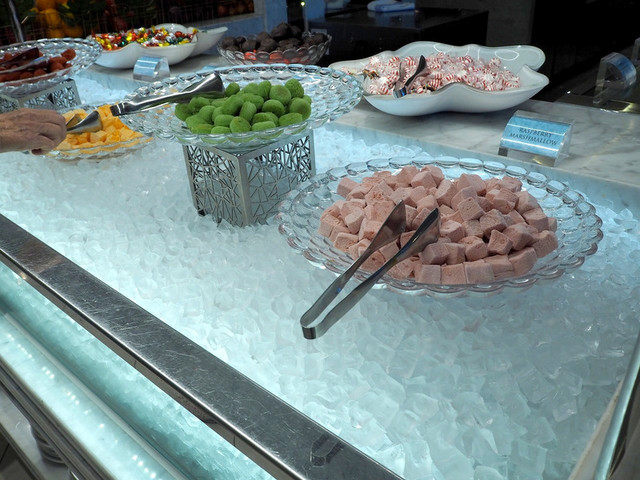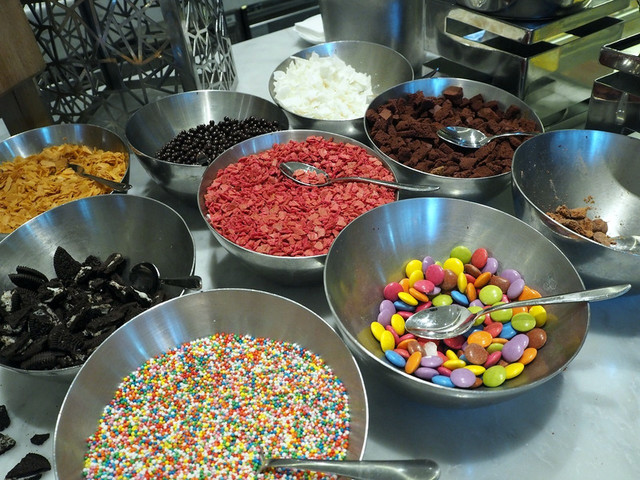マシュマロなど、日本ではなじみが薄いスイーツも充実、美味しそうで食べてみたいと思いましたが、ここまで楽しむことができませんでした。これは、アイスクリームのトッピング。カラフルなトッピングは海外ならでは。好みのアイスクリームに派手なトッピングを楽しむ大人が多くて驚きました。