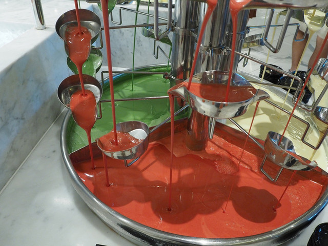 巨大なツリーは、チョコファウンテン。クリスマスカラー3色のチョコレート、フルーツやマシュマロに絡めて楽しみます。子供だけでなく大人まで笑顔でチョコレートの流れを受ける姿はとても微笑ましく見えました。美味しいものを見ると、みな笑顔になるのですね。