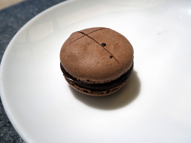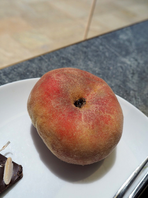 妻は、ドーナッツピーチをもらってきました。「色合いから甘いに違いない」の見立ては正解!果汁たっぷりの甘い白桃、日本にもあったらいいのにと思いました。甘いとわかっていても、マカロンをいただきました。チョコレートの風味抜群、甘いのですが、口の中ですっと溶ける食感が◎チョコレートも上品な甘さでよいもの。
