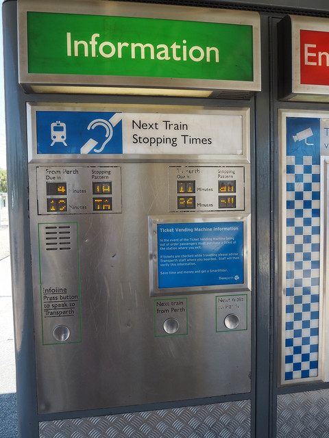 駅のロータリーで降りて電車へ。駅舎がない無人駅、このフェンスの先にホームがあります。切符は自販機で購入するか、チャージ式の「SmartCard」のいずれか。「SmartCard」を利用する場合は、この機械にタップしてから乗車します。駅はシンプルな構造。ホームの上には待合椅子がある屋根付きの部分があるだけ。屋根の下にはこの案内マシーンと、非常用の連絡電話があるだけ。機械には、次に来る電車が来るまでの時間が表示されているほか、下のボタンを押すと、音声でお知らせする機能も付いていました。