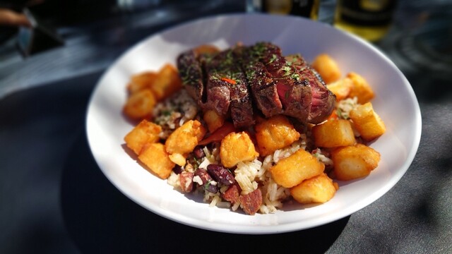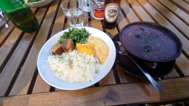 ブラジル料理初体験。チャーハンの上にビーフステーキとフライドチーズがのっていて、ピクルスのような酸味のある野菜が食欲をそそります。ボリューム満点でコストパフォーマンスがいいです。他の料理も美味しそうで...