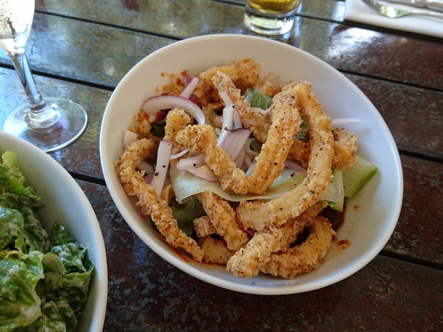 プレーゴ夫の前菜はイカのフリットが添えられたサラダ。
