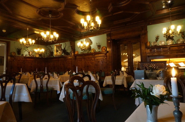 ザルツブルグのザッハーのダイニング。鹿や鳥のトロフィーに囲まれた部屋。雰囲気は申し分ありません。