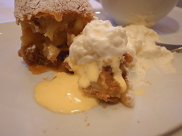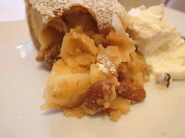 口に含んでみれば、確かにアップフェルシュトゥルーデルのレシピ通りにはこさえてある。リンゴも生から焼き上げた物だろうし、パン粉も、ラムレーズンも、ラム酒も、シナモンだってちゃんと効いてる。にも関わらず、どうしても今一歩舌に届かぬ味わい。不味くはないよ、でも、コンディトライ・オバーラ、カフェ・デーメルには、叶いっこないレベルの出来。醒めた表情でパクパクあっという間に完食。