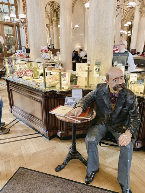 入口を入った目の前には「カフェ文士」として知られるオーストリアの作家ペーター・アルテンベルクの等身大の人形が座ってお出迎え。