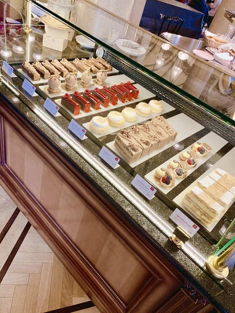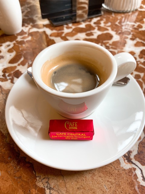 まずは3か所に分かれているガラスケースの中からケーキを選んで店員に伝え、席についてエスプレッソを注文しました。