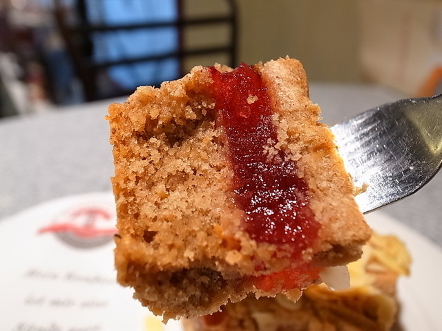 レシピは極めてシンプルだが、味わいはかなり大胆。ボソボソとした巨大で分厚いビスキュイ生地をベースとし、中央部に木苺ジャムをたっぷり注ぎ込む。ジャムの上には、同じビスキュイ生地にて綺麗に格子が形成され、仕上げは周囲に撒かれた多量のスライスアーモンド。その味わいは、日本の焼き菓子とはちょいと違う。かなり強烈なシナモンのスパイシーさに、火入れされ水分が飛んだカッツリ木苺ジャムの歯に染みる程の甘酸っぱさ。生地の密度は相当高く、つまり重い。フォークを無理に立てようとすると、バコッと割れて、フォークがカチャ~ンと皿をどつく事になる。とにかく、手作り感満点の素朴な外観には似合わず、その喰い味はかなり硬派。流石に世界最古と言われるだけの骨太さ。こいつも間違い無くオーストリアケーキの代表選手である。
