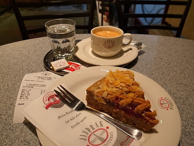 オーストリア・リンツでケーキと言えば、いつもJINDRAKになってしまってう。とにかくこの血には、他にまともなケーキ屋さんが無いのだ。今回のJINDRAKのリンツァートルテも、空港に行けばラップされた箱入りホール物がお土産用で山積みされてるんだけれど、残念ながらお店で喰う一個に比べるとフレッシュ感が希薄。やはりお店で喰う作りたてのリンツァートルテは一味違うのだ。しかしこのサイズで300円弱ってのは、やはり安いよなぁ。お菓子の安い欧州が心底羨ましい。