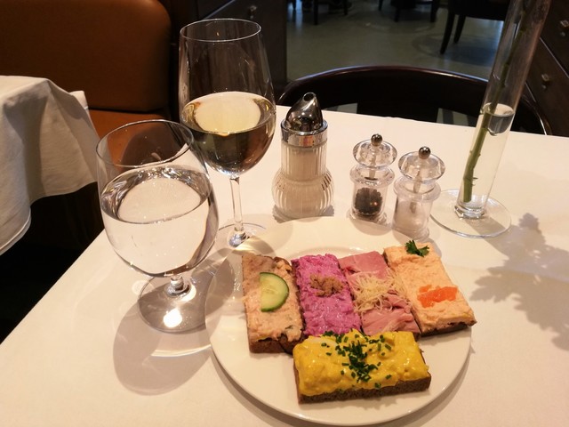 • Zum Schwarzen Kameel - ショーケースから選ぶ色鮮やかなカナッペ5種、白ワイン1杯で11.3ユーロ