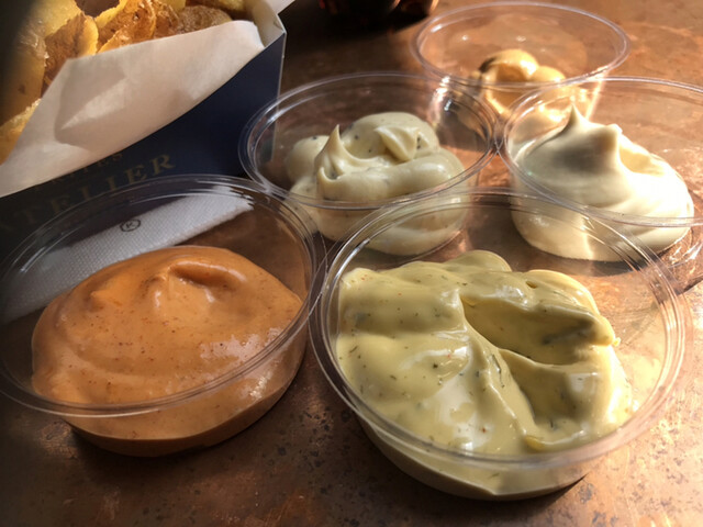 〈フレンチ•フライ〉はベルギーのナミュールが発祥で三つ星シェフが操るとこうなる。オリジナルのソースが3種類とマヨネーズが5種類が選択できる。