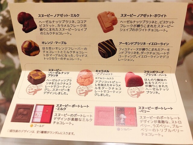 スヌーピーノアゼットミルク、ホワイト、ヘーゼルナッツプラリネの3つが入っています。