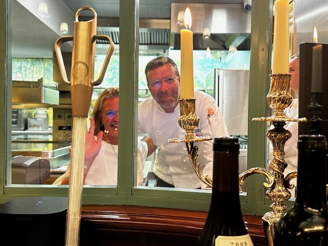店内はアールヌーボー調のこじんまりとした空間で「我が家で食事しているような」という店名どおり、リラックスして食事を楽しめました。厨房すぐ手前の席だったので料理人さん達の働きぶりがよく見えたのですが、手前にメートルを兼ねているマダム(4代目オーナー。シェフの奥様)がデンと座っています。大体しかめっ面をして書き物をしたり料理人に指示を出したりしているのですが、目が合うと笑顔で手を振ってくれるチャーミングな方です。