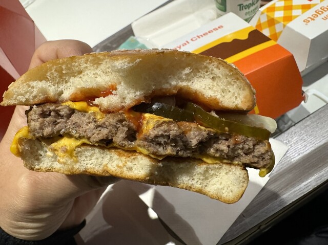 ロイヤルチーズの断面。味は日本のチーズバーガーに似てました。違いは肉の厚さくらいかな。