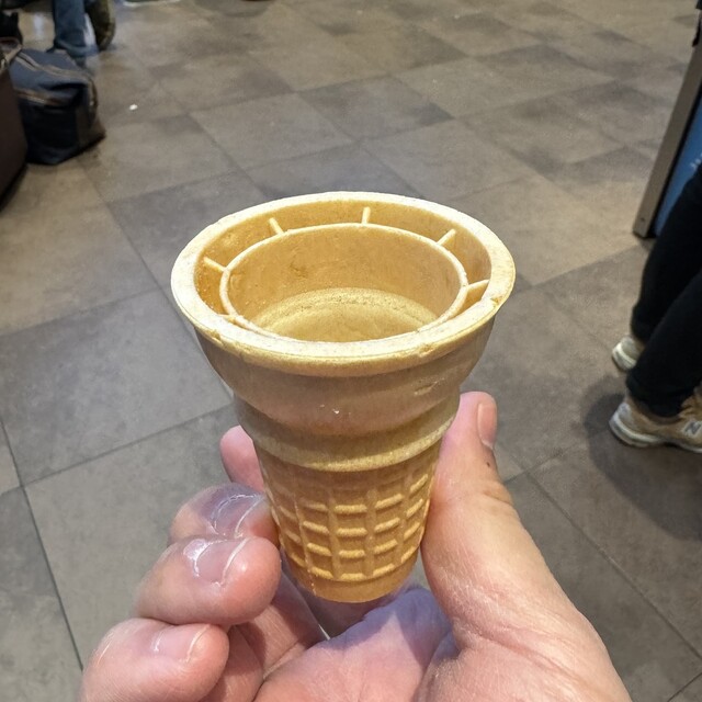 ハッピーセットのソフトクリームは、空っぽのコーンだけ渡されるので、あとで自分でカウンターまで貰いに行きます。そうしないと、食後に食べるソフトクリームは融けちゃいますからね。そして、このソフトクリームの影響からか、ハッピーセットのドリンクの選択肢に「マックシェイク」はありませんでした。