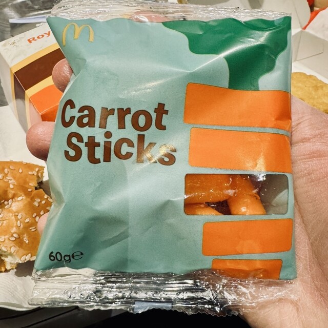 そして、トレイの上には、注文した覚えの無い謎のニンジンが(笑)。レシートをよく見ると、ハッピーセットにこのニンジンが付いているようです。生のニンジンで、丸っこい形にカットしてありました。子供が誤飲しても大丈夫なように考慮されているのかな。おもしろいですね。このニンジンは、偏食のうちの子はちょっと食べられないので、私が食べました。何だか動物になった気分(笑)。