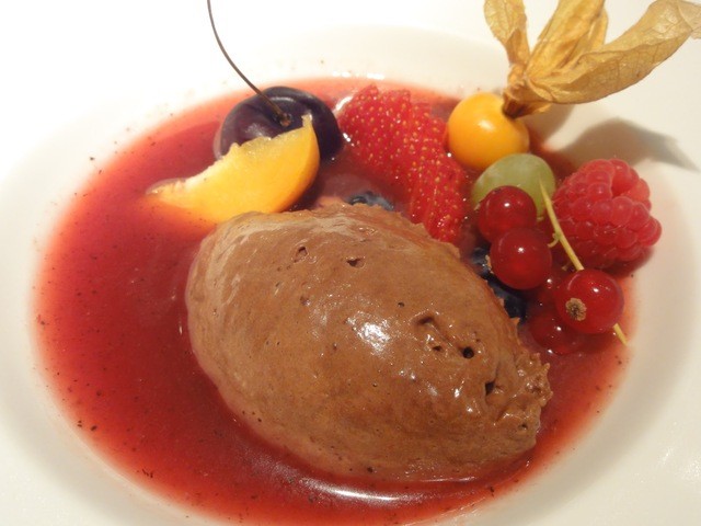 デセールにチョコムース兼イチゴのスープ。ベリー尽くしで途中で飽きた。妻は絶賛してたので、好き好きですね。