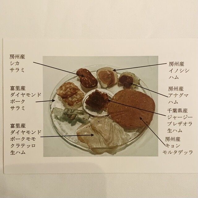 ★ サルメリア(伊流加工肉の総称)盛合せ8種(豚腿、キョン+実山椒、猪腿+紅はるか添え、猪サラミ、豚頬、豚サラミ+パプリカのサラミ、ダイヤモンドポーク、ジャージー牛肩+ビーツ添え