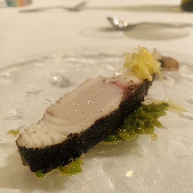 ⑨ 魚【神経〆地魚のクルード(冷製)、カルボーネ(炭火)