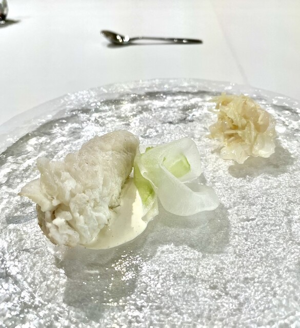 ⑥ ワニゴチとジャージー牛のセンマイ カサゴ 魚の出汁と オリーブオイルを乳化したソース