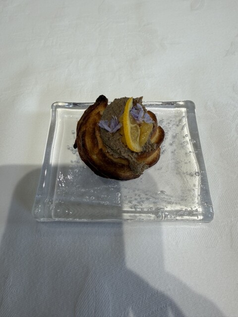 鴨のレバー、ローズマリー花、金柑、グリッシーニ
