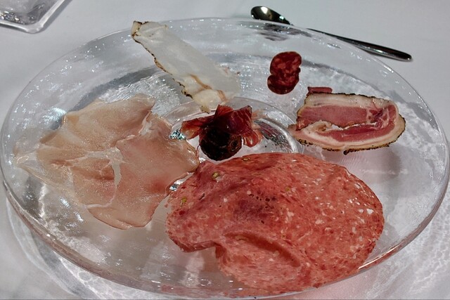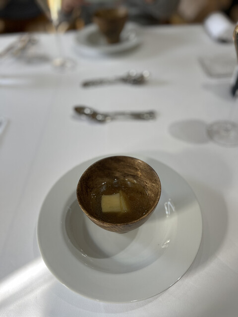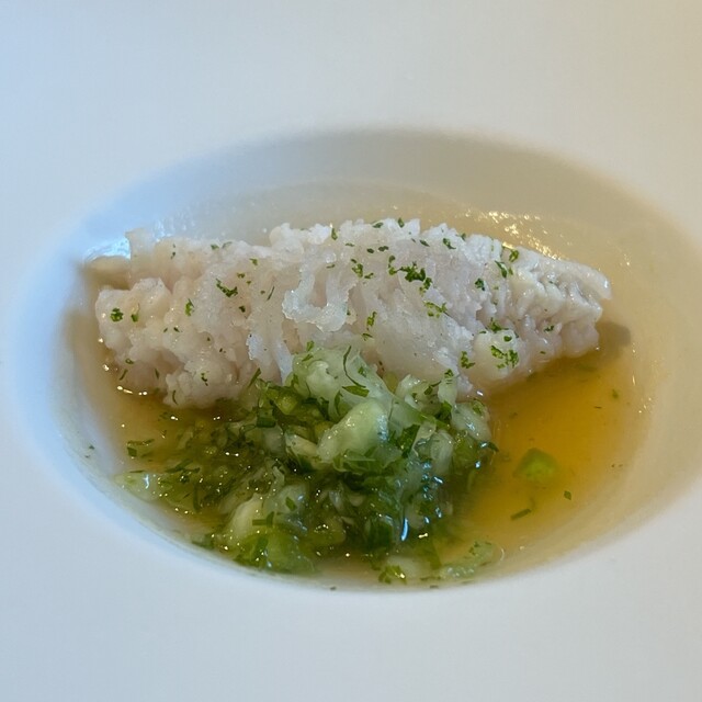 カサゴからのスタートです。スープと一緒にいただきました。上品で美味しいです。野菜のアクセントが食べていて楽しくさせてくれます。