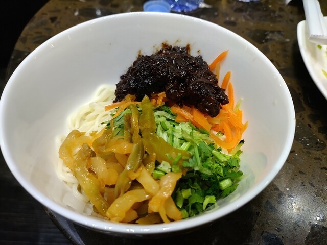 重慶小面に香草と漬物をたっぷり入れて、中華おかずとともに白飯を