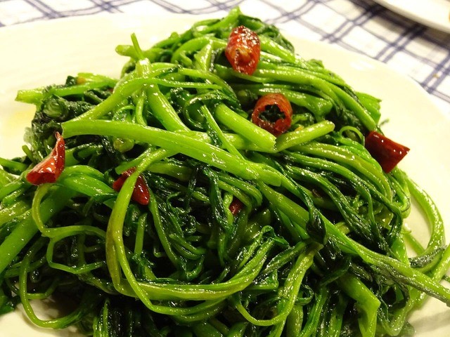 緑のほうれん草に赤い唐辛子がきれいだが、思ったほどは辛くない。