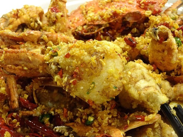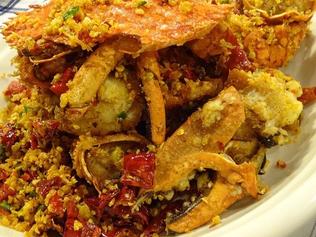 唐辛子と何かプチプチ食感の物を合わせた素揚げの蟹・・・