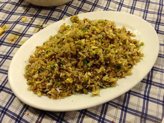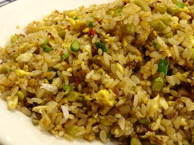 パラパラ系のチャーハン・・・具は玉子に鶏肉、茎野菜。
