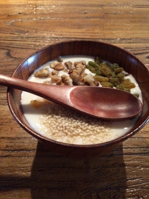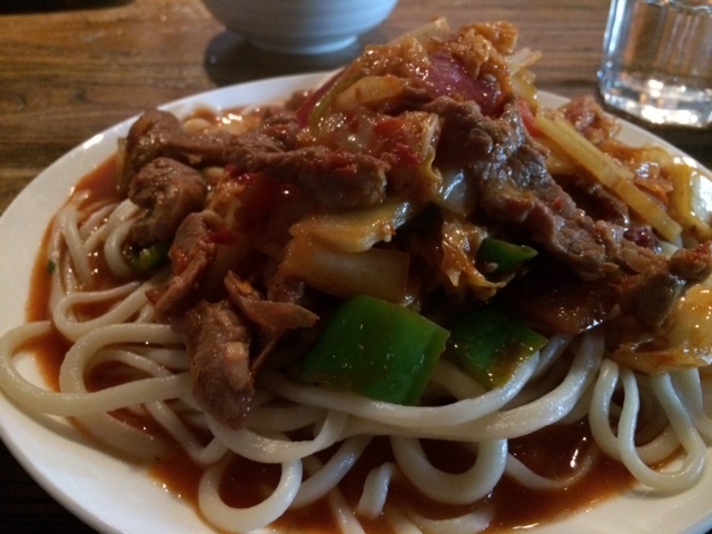 注文したのは、なんたら烤茄子(ウイグル式の焼きナス)、紅柳烤羊肉串(タマリクスの串を使ったヒツジ肉の串焼き)、招牌拌面(看板メニューのウイグル式混ぜそば)、手工酸奶(手作りヨーグルト)。とても可愛らしい器に盛り付けされた焼きナスは、茄子自体も美味しいし、少し酸味の聞いた味付けが絶妙。串焼きのお肉は、店名にもなっている農場の物でとても新鮮だし、臭みは全くないし、噛むのに力が要らないくらい柔らかいし、串に使っている素材の香りも加わって、滋味に富んでいてたまらない一品。まぜそばは、看板メニューと言うだけあって、トマト味のソースに色んな野菜やお肉の出汁がでていて、稲庭うどんのような麺によく絡まってきて美味しい。デザートのヨーグルトは、トッピングされている特産のクルミやレーズンと混ぜて一緒に食べる素朴で優しい味のヨーグルトで、とてもほっとする。