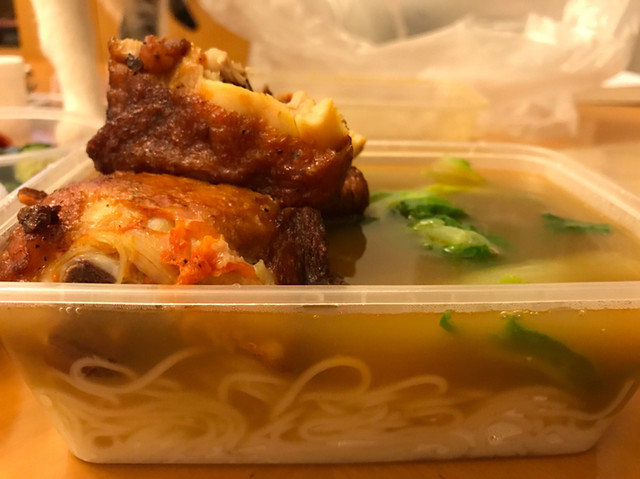 麺は、完成品の状態でデリバリーされるのではなく、麺とスープ、トッピングはそれぞれ別々のタッパーに入れられていて、それをセルフで一緒にして完成させるみたいですね。麺は、これならのびないのかもしれませんが、タッパーの形に固まっていて、ほぐすのが大変でしたね。あと、伸びないのだから、スープは通常より熱い温度でお店から出してくれるとありがたいですけどね。まあ、電子レンジなどで温めることも可能ですけど。