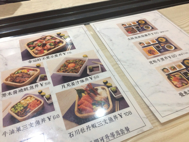 ランチは、海鮮丼やうな丼といった丼物がメイン。それに、お味噌汁や茶わん蒸しなどを付けて定食にする事もできるようです。定食にすると、だいたいお値段が100元近くになるので、結構高くなりますね。