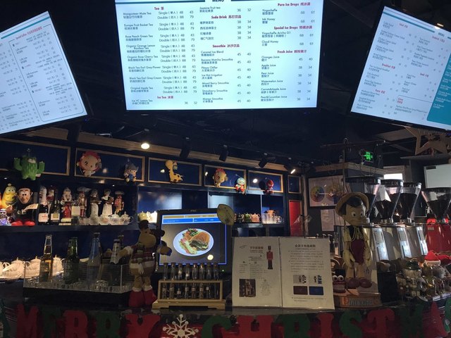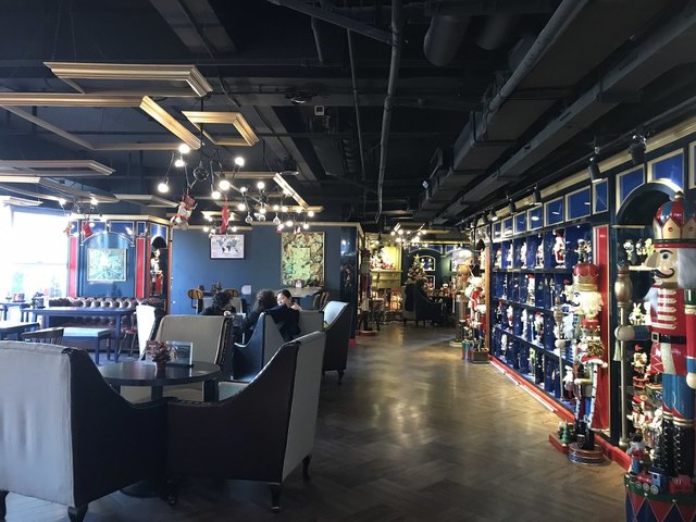 でも、外の席は寒いし、今日は中の席でランチ。中も、おもちゃがたくさん並んだ特徴的な内装。