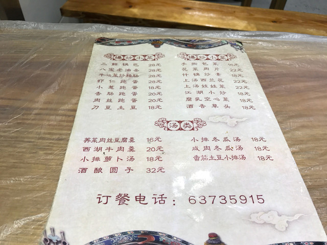 メニューを見ると、料理の種類はたくさんあり迷います。良く出る料理をたずねたところ、塩漬けしたたまごの黄身を絡めて炒めた鶏肉や豚肉と、あとは上海周辺で食べられる草頭という青菜を白酒で香り付けして炒めた酒香草頭がとの事。てことで、その2つにご飯を注文しようと思ったのですが、後者は、一組前の客で売り切れちゃったとの事…。仕方がないので、同じ野菜メニューから、空芯菜の腐乳炒めを注文。