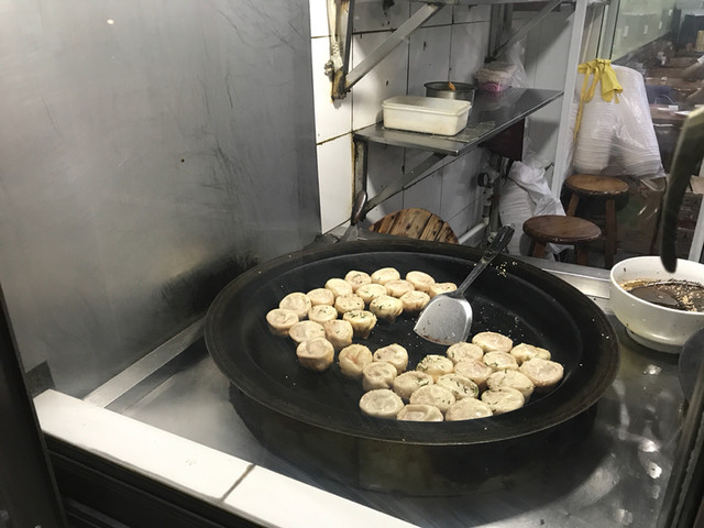 生煎包は、皮は薄くて硬い無発酵のもので、おへそ部分を焼いたタイプ。中は、たっぷりスープで、食べるのに失敗してズボンにスープを撒き散らしてしまいました。餡は大きめで、甘くない味付け。小楊生煎が好きな人は、こちらの生煎包みも好きだと思います。