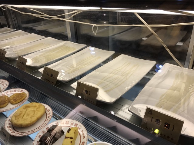 入ってすぐ左手にある注文カウンターで注文です。私は牛肉麺のセットを注文。すると、麺の太さを聞かれたので、一般的な細麺をチョイス。よく見ると、ショーケースの中に、麺のサンプルが置いてありました。太麺は、かなりの太さの麺でしたね。太さを色々試してみたいですね。