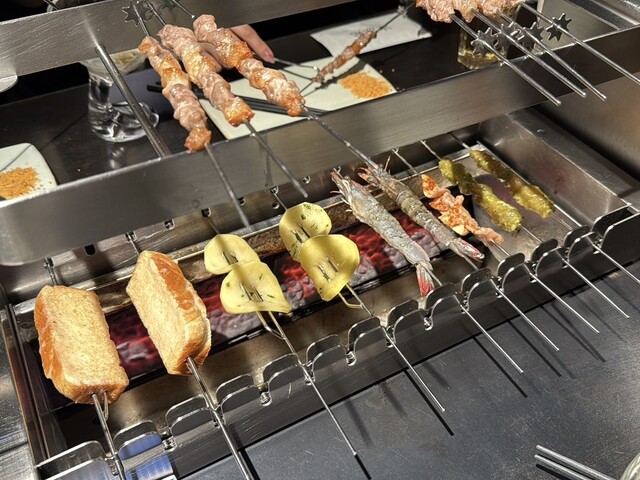 ラム肉の串の他にも肉、野菜、海鮮、パン(?!)などの串があります 串を並...