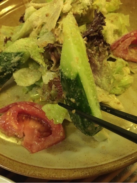 サラダのゴマドレッシングはおいしかった~\(^o^)/すりごまと粉チーズって合うのね(≧▽≦)