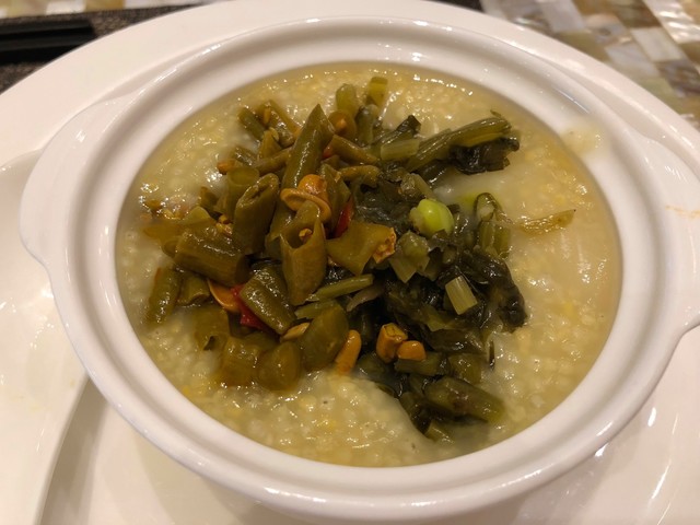 お粥は黄色くて小さなつぶつぶがあるのに、高菜とか、いんげん辛子味などをのせて頂いた。多分、稷だと思う。