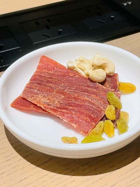 ポークジャーキー、カシューナッツ、干しぶどう。