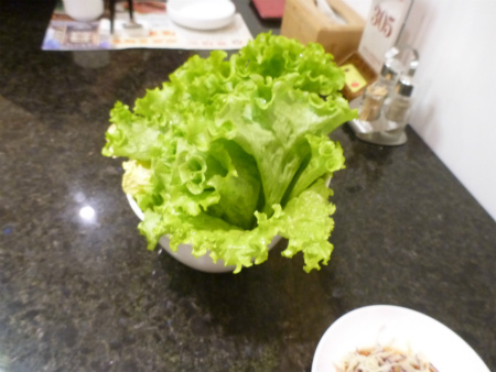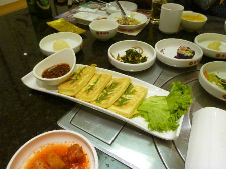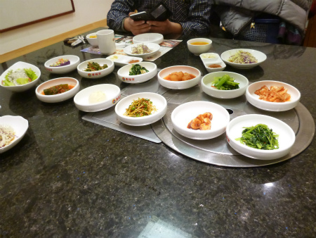 韓国スタイルなんでサービス品が14皿運ばれてくる、包み野菜と味噌、大蒜、青唐辛子もサービスで・・