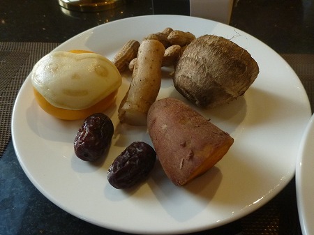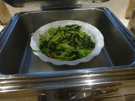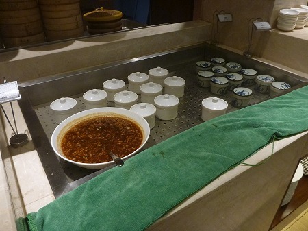 今回はお粥3種とフライドエッグ、チキンウインナー、ほうれん草炒め等、蒸し野菜、点心等を頂きました。
