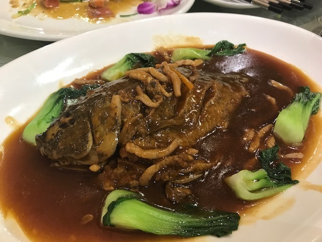 海鮮は確かによくあるホタテに春雨と大蒜をたっぷりまぶしたもの(これは美味い)や、大ぶりな魚をそのままの姿に調理して野菜を添えて出す様なもの。これはいつもの様に川魚では無い。
