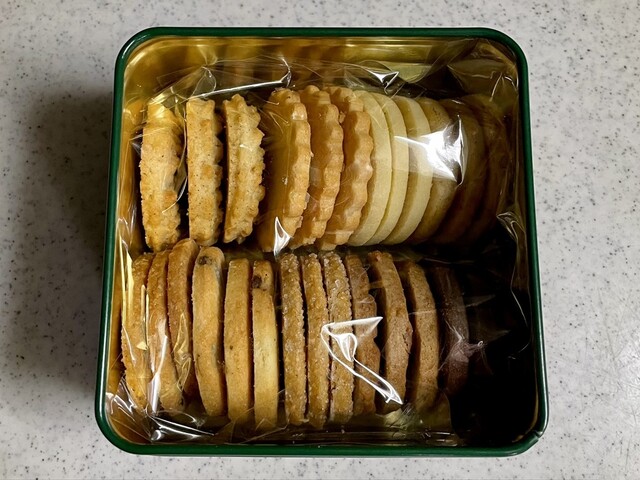 素敵な色合いの四角い金属缶には、9種類のクッキー
