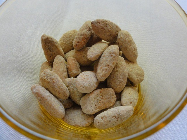 お通しにアーモンド。周りにスパイス?不思議な味のする粉が振...