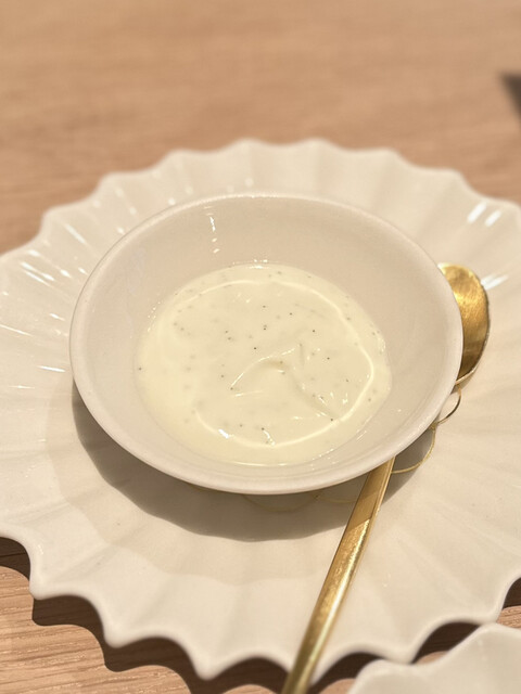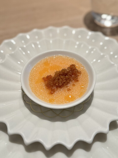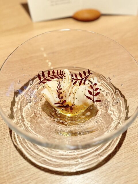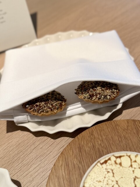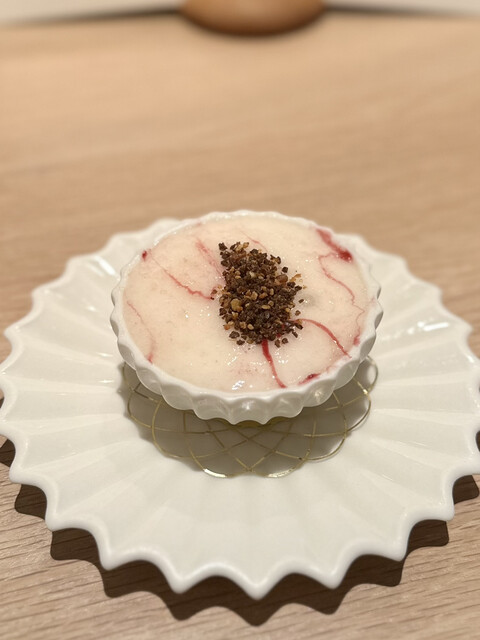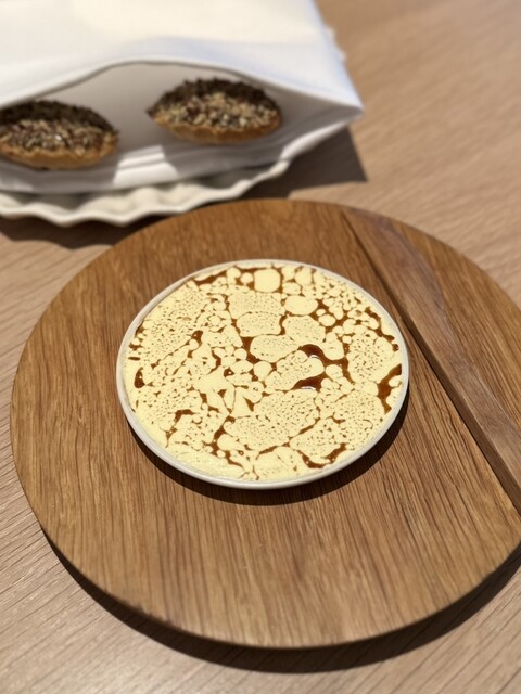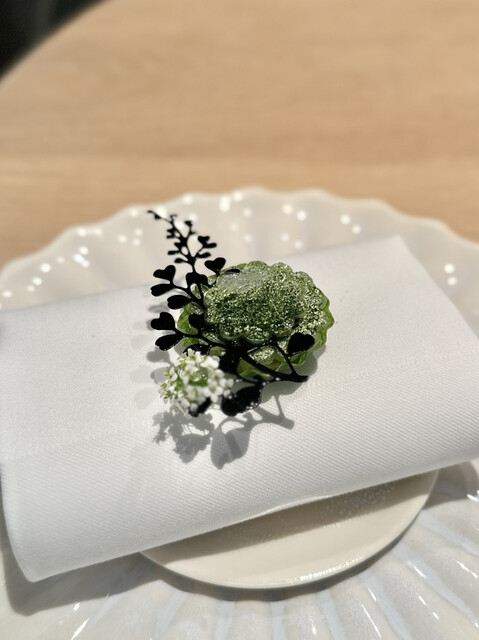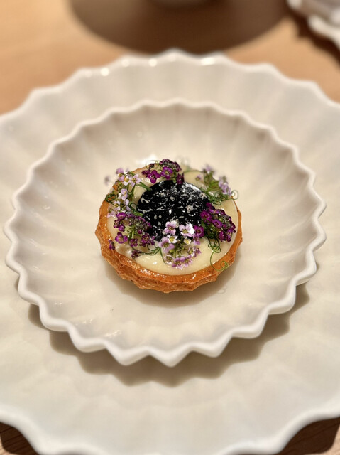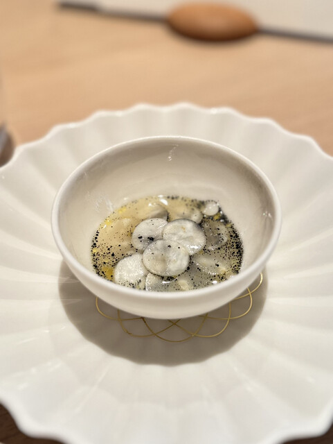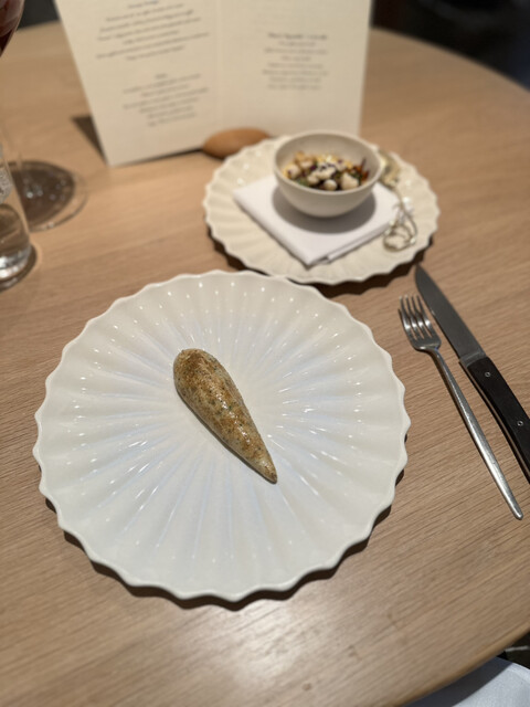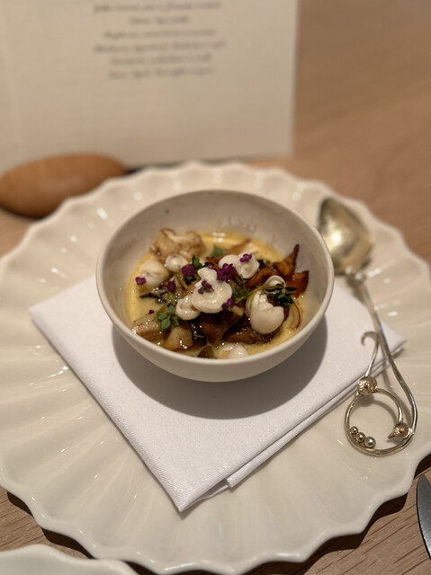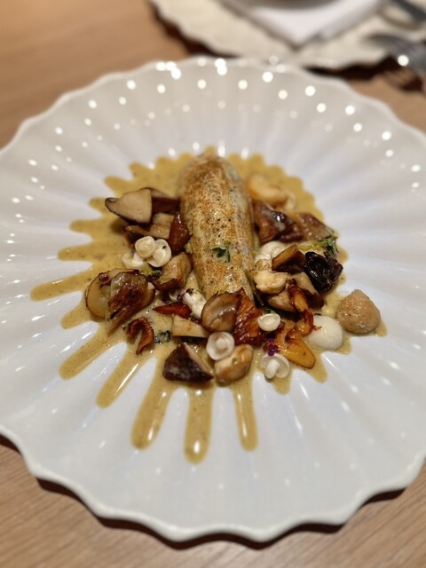 美しく繊細な品々はとても芸術的です。皿との調和も考えつくされており、視覚に訴える力が凄いです。最初の驚きは「「ビルケモセガルド」産の茹でたビーツ ホースラディッシュソース」。花びらをかたどった赤と濃い紫のビーツを交互に配列し、カラフルで美しい。ホースラディッシュクリームはビーツに相性が良いですね。美しくて美味しい一皿に期待が増します。「コールラビ ソル(海草の一種) 若いリンゴ ヘーゼルナッツ キャビア」も皿と料理が一体化しているというか、視覚的完成度がとても高いと思いますね。「様々な種子を纏わせたパン」に「コーヒーバター」とそれぞれの料理が一ひねりされており、食べた事が無い料理ばかりです。肉を使わないミートフリーなのでメインも魚中心「ヒラメのフィレムーズにエンガワを詰め、ピクルスしたエルダーベリーとキノコのソース」これもなかなか考えられたものですね。ヒラメのフィレ自体はそれほど大きくないんですが、たっぷりすぎるソースがとても美味しい。キノコの出汁が効いて旨みが強いソースです。