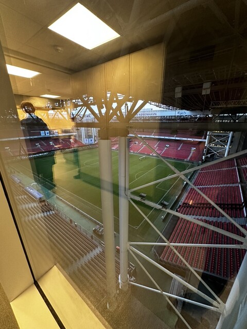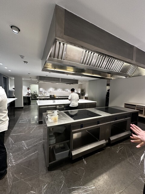 メインを食べ終わったところでレストラン内の見学です。驚いたのは奥の部屋に入るとガラスの先にはスタジアムを見下ろす絶景。サッカー観戦をしながら食事もできるという事なんでしょうね。キッチンで働く従業員の方々は見られることになれているようで、皆さん笑顔で挨拶してくれます。