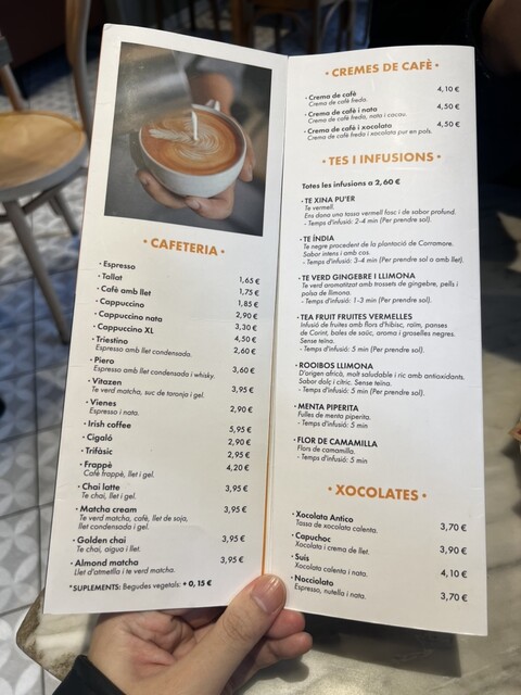 バルセロナで立ち寄ったカフェ「Antico」は、落ち着いた雰囲気のこぢんまりとしたお店で、観光の合間に少し休憩をしようと思い入店しました。今回は店名がついたハンバーガー「Antico」とカフェラテを注文しましたが、正直なところ、あまりオススメはできない体験だったと感じています。