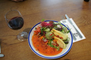 リーフサラダにガスパチョのようなものがたっぷり。さすがスペイン♪