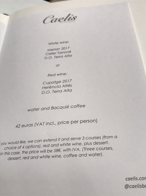 ランチは€42のコース(赤か白1杯のワイン付き)と、メインが2種類になる€58のコース(2杯のワイン付き)が有り、